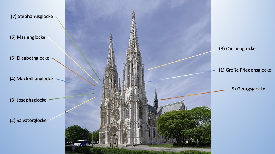 Die neue Glocke wiegt 6.000kg und kehrt in den Nordturm der Votivkirche zurück. Ihr Schlagton f° wird mit den übrigen Glocken im Südturm das große Friedensgeläute der Bundeshauptstadt bilden.