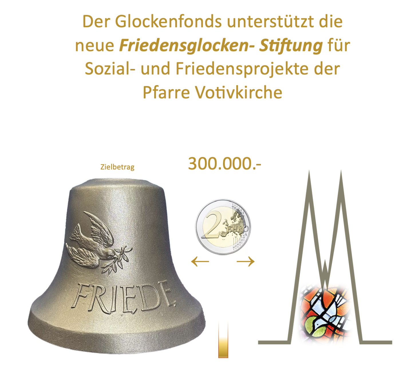 Ihre Spende für die Friedensglocke kommt zugleich sozial bedürftigen Menschen zugute. Die neue Friedensglocken- Stiftung wird auf Dauer zur Förderung von Sozial- und Friedensinitiativen durch die Pfarre Votivkirche eingerichtet.